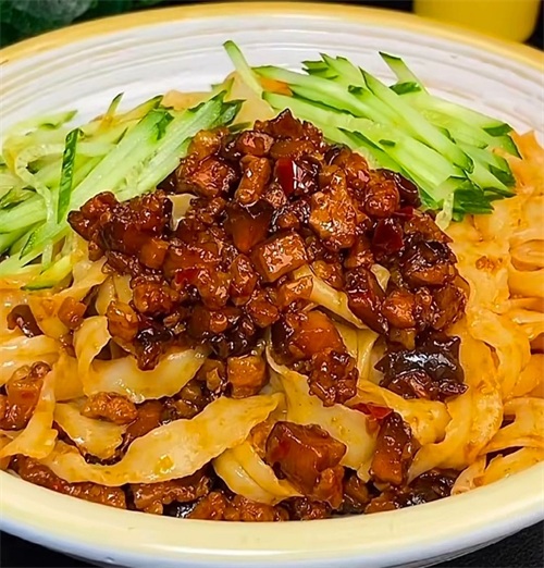 步骤三:煮一大碗面条,根据自己的喜好,加一点配菜,黄瓜丝,脆爽解腻,舀一大勺香菇肉酱,这拌面太香了吧!这个酱即可以拌面条,还可以拌米饭,夹馒头吃,都是相当下饭!