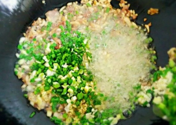 3.炒锅烧热放入适量的食用油,将肥七瘦三的五花肉丁放入锅中炒出猪油,当猪肉微微发黄的时候,放入准备好的配料,爆炒出香味。