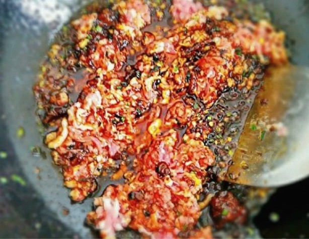 5.炒至两分钟后向锅中倒入半碗清水。开小火慢慢熬熬出酱香味。加入适量的十三香,期间一定要不断的翻动,等水分蒸发的差不多,就可以了。
