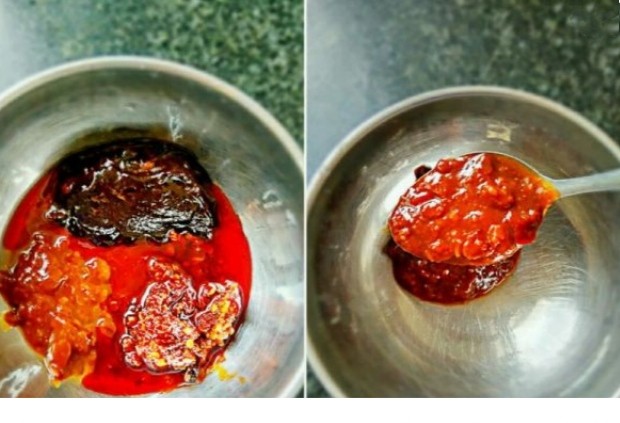 准备料汁:一勺甜面酱,两勺黄豆酱,两勺老干妈风味辣椒酱放了碗中备用。