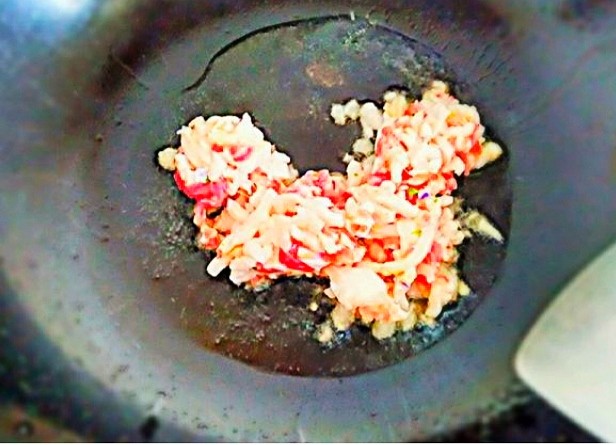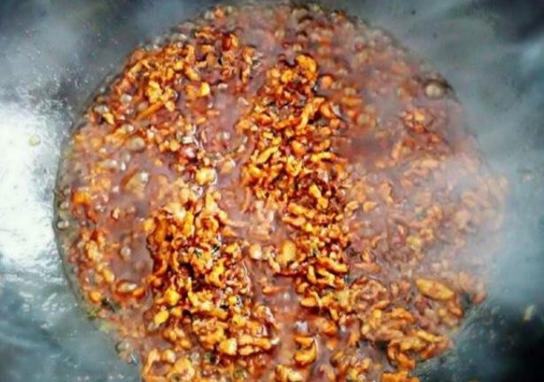 4.最后再放入准备好的料汁翻炒均匀,炒制过程中一定要用小火。否则准备的料汁容易炒焦,炒制2分钟。