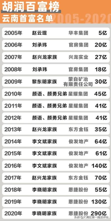 而在最初几年的胡润富豪榜上,地处西南边陲、经济相对落后的云南,一直都榜上无名,直到2005年,榜单中才出现了一个云南人——赵云琨,华丰集团老板,以5亿元的资产位列榜单第351名,成为首任云南首富。