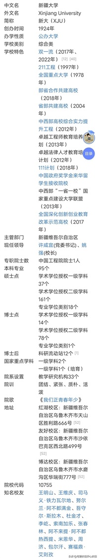 新疆大学是一所位于新疆维吾尔自治区乌鲁木齐市的综合性大学,是教育部与新疆维吾尔自治区人民政府共建的高水平大学,也是国家“双一流”建设高校,211工程”建设高校、国家西部大开发重点建设高校,入选国家“111计划”。