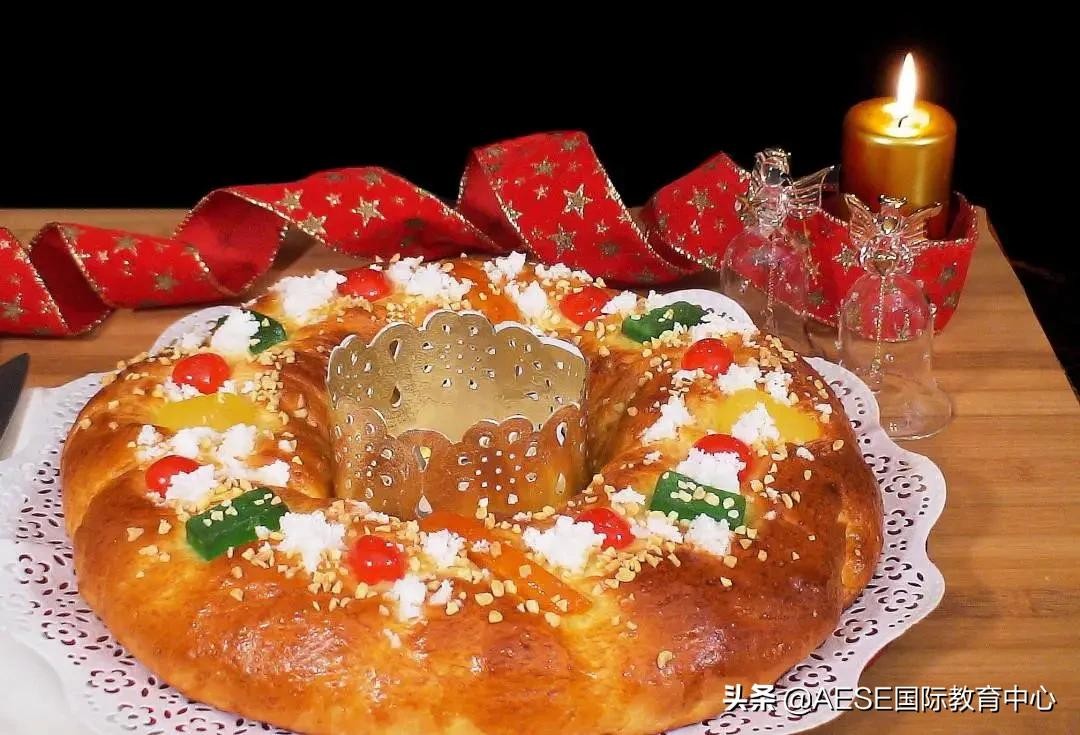 除了收礼物,看花车游行以及抢糖果这几个保留项目以外,西班牙的家家户户还都会在三王节这一天吃一种甜品,叫做国王蛋糕Roscón De Reyes。它是一个像蛋糕那么大的甜甜圈,里面填有奶油。圆形中空的外形象征皇冠,蛋糕上摆的水果或干果则是象征皇冠上的宝石。很多糕饼店还会附赠个纸皇冠来给国王蛋糕作点缀。
