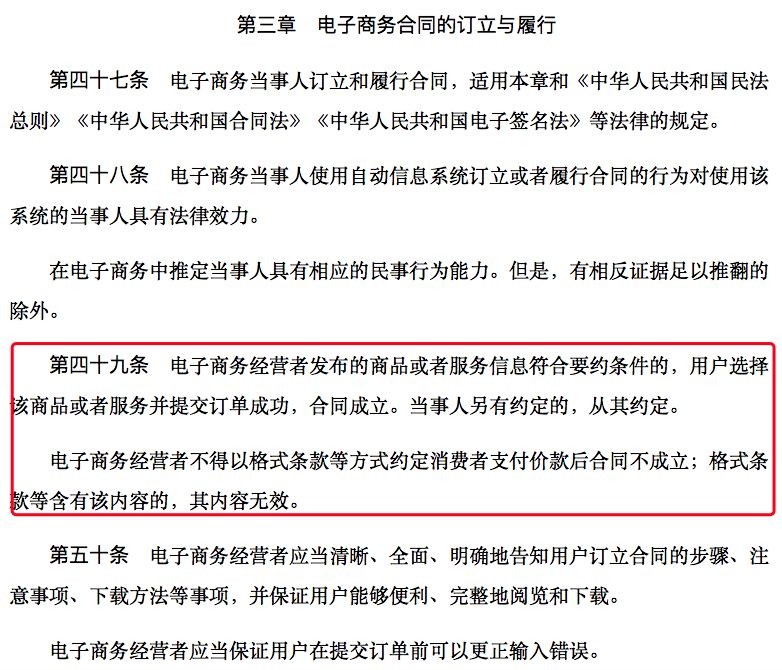 根据今年起正式实施的《电子商务发》第四十九条:“电子商务经营者发布的商品或者服务信息符合要约条件的,用户选择该商品或者服务并提交订单成功,合同成立。当事人另有约定的,从其约定。电子商务经营者不得以格式条款等方式约定消费者支付价款后合同不成立;格式条款等含有该内容的,其内容无效。”