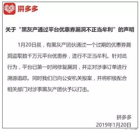 同在上午,拼多多官方发表声明,有黑灰产团伙通过一个过期的优惠券漏洞盗取数千万元平台优惠券,进行不正当牟利,公司已经报案。