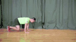 双手支撑于地面,采类似婴儿爬行的姿势,但要注意双膝不能跪地,并保持头部及背部平直,勿拱背。右手向前移动的同时左脚跟进,再换左手、右脚前进,重复动作。一组爬行约前进 20 步,亦可训练后退的动作。