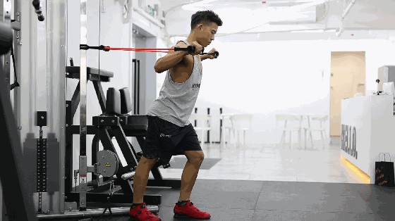 将弹力带固定,呈弓箭步,把弹力带举至胸前,水平向前推移,稍作停顿后再慢慢回到起始位置。过程中注意肘部不要锁死,并将力量集中于胸部。每组做 10~15 下,共做 3 组。
