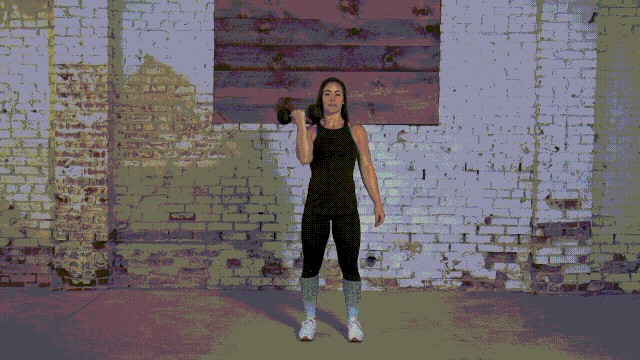呈站姿,单手持重量适当的哑铃,以肩膀上方作为起始位置,向上推举哑铃,停顿一秒后下降,以锻炼肩膀的方式,带动前锯肌一同收缩。每边做 8~12 下,左右交替为一组,共做 3 组。