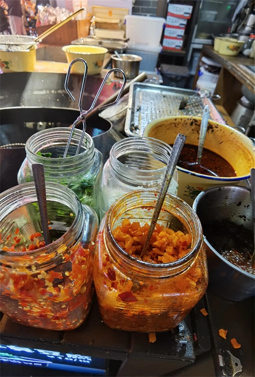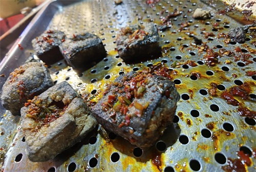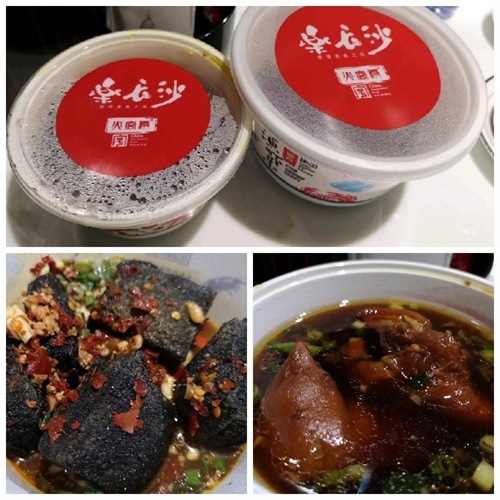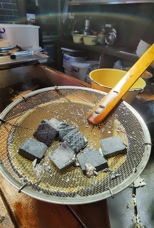 火宫殿美食首推臭豆腐。有传说源自北京的王致和臭豆腐,事实并非如此。据《长沙饮食志》载,长沙臭豆腐源自左宗棠老家~湖南湘阴县,起初叫油炸豆腐,当年由湘阴县传入长沙后被姜二爹发扬光大,做出了特色,成为上个世纪三四十年代火宫殿小吃中一绝。后来火宫殿根据长沙人的口味进行了改进,挑选色泽新鲜、颗粒饱满的黄豆,制成老嫩适宜的豆腐坯,用冬菇、香冬笋、曲酒、浏阳豆豉等原料制成的发酵水浸泡,沥干水分后慢火油炸,再在豆腐中心钻一小孔,灌入辣椒末、酱油、芝麻油等佐料。火宫殿臭豆腐具有“黑如墨,香如醇,嫩如酥,软如绒”的特点。