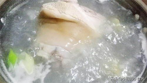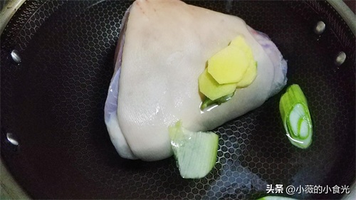 凉水锅中放入洗净的猪肘,加葱段,姜片和2勺料酒点火开始焯水