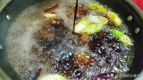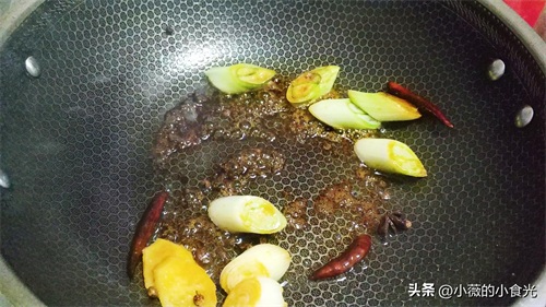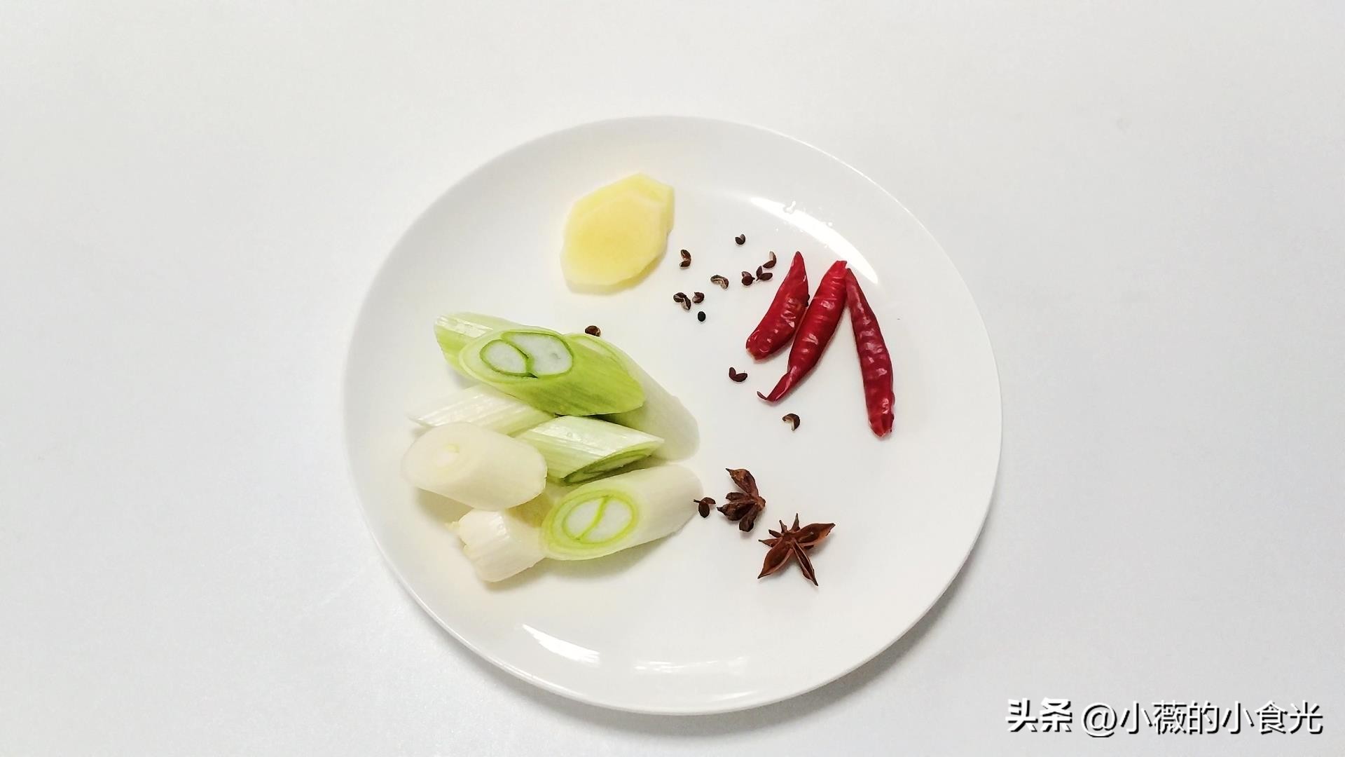 准备香料:葱段,2片姜,几粒花椒,干红辣椒,2个八角