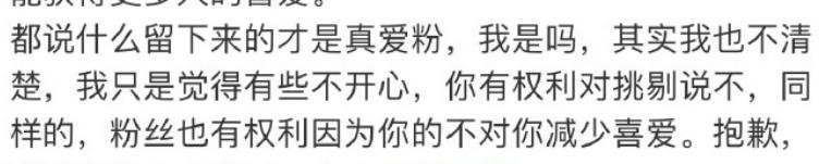 “都说真爱粉就不要脱粉,可我现在就是觉得不开心,你有权利挑刺,粉丝也有权利因为你的不对减少对你的喜爱”。