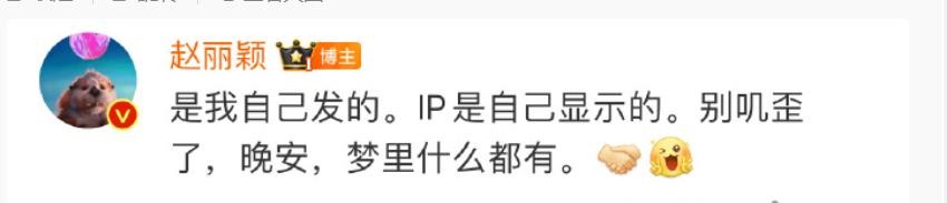 直到赵丽颖在评论区回复:“文是我自己发的,IP是自己显示的,别叽歪了,梦哭什么都有”。