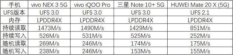 与此同时,有专业测评机构曾针对目前市面上已经发售的5G旗舰手机做了相关测试,从下面的测试结果来看,配备了UFS 3.0高速闪存的iQOO Pro 5G版与NEX 3 5G无论是在持续读写还是在随机读写方面都明显要比采用UFS 2.1闪存的华为Mate20 X 5G更快。而且,得益于高通骁龙855 Plus的性能加成,vivo的这两款手机的数据读写速度均比搭载高通骁龙855处理的三星Note 10+ 5G更高,这也意味着vivo旗下的5G手机拥有更强悍的性能表现。