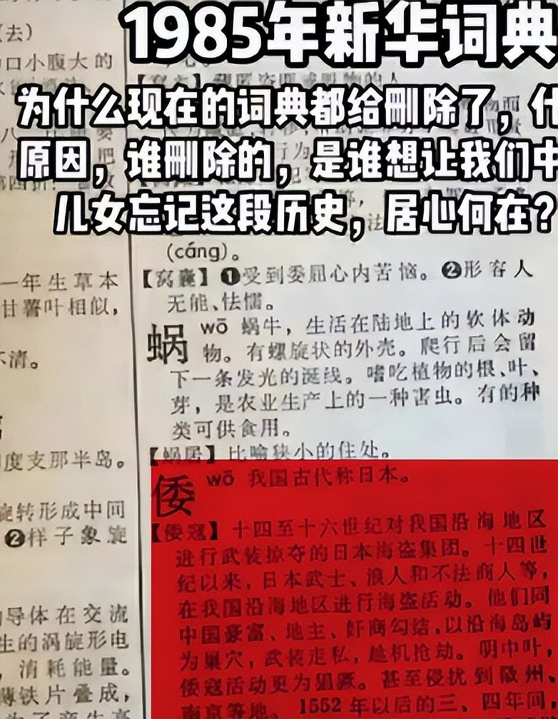 更厉害的是,其他字都有相应的解释和组词,结果到了“倭”字,只简短的说了一句“古代称呼”就没了,旧版对其的解释直接被吞掉。