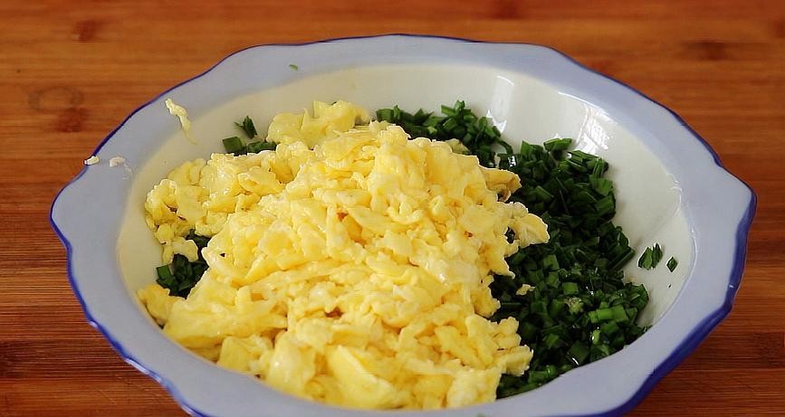 6、鸡蛋炒好之后,咱们就开始调馅料,向韭菜中加入已经炒好的鸡蛋,然后加一点点虾皮,再加入两克十三香,一克花椒粉,少许的鸡精,10克老抽,20克蚝油,加入切好的姜末,食用油30克,最后加入食用盐,搅拌均匀,馅料就做好了。