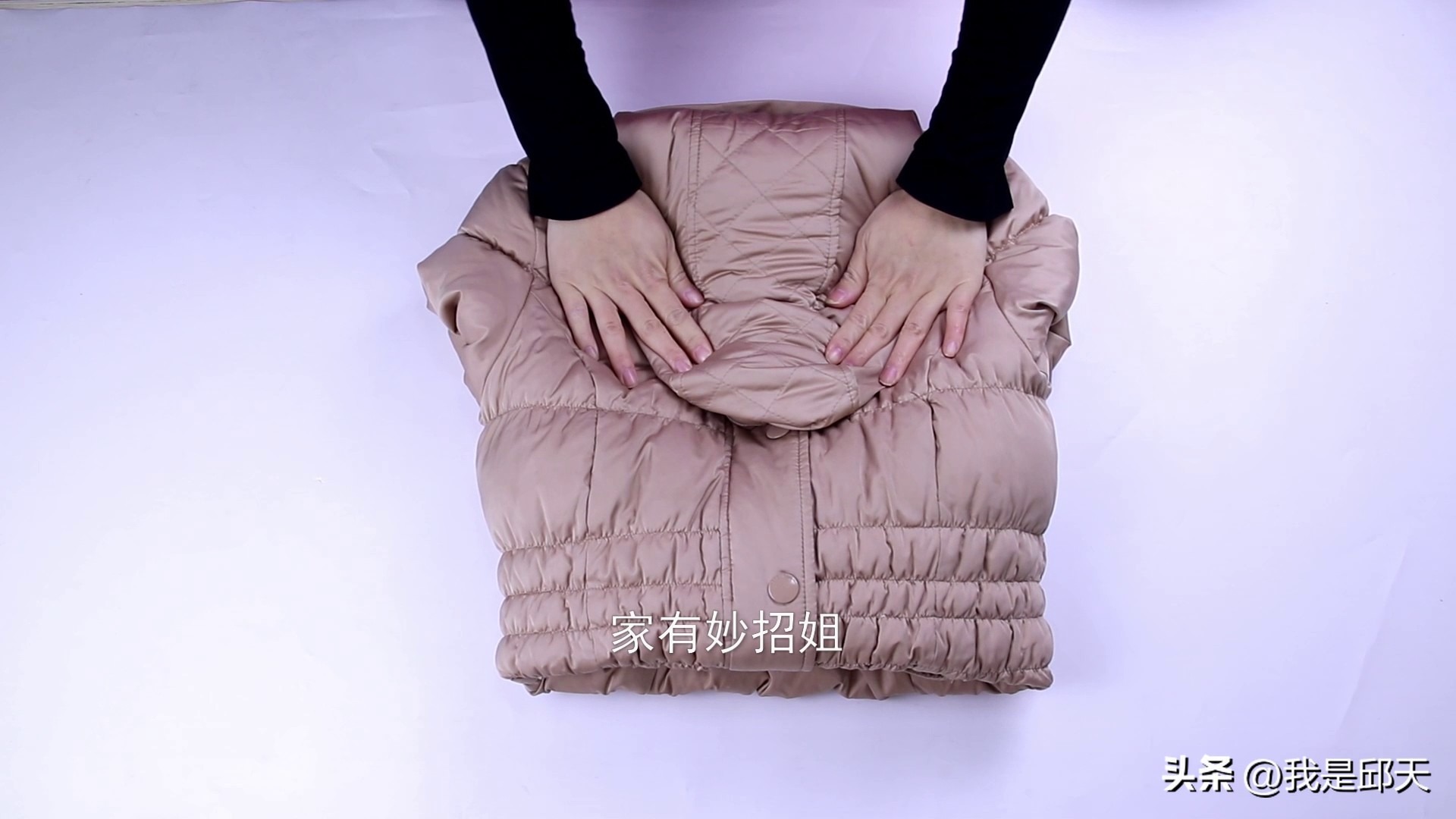 接下来,我们再把衣服上面的帽子向下折叠并整理平整,这样一件羽绒服就处理好了。