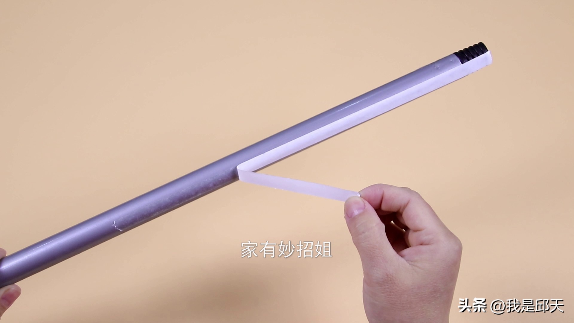 刚刚从羽绒服帽子上拆下的毛领,我们也可以将它改造一下。方法很简单,我们需要先准备一个棍子,比如家里废旧的拖把或扫把上的杆子都可以,将杆子取下来后,我们再准备一点双面胶,在杆子的两边都分别粘上一长段的双面胶。