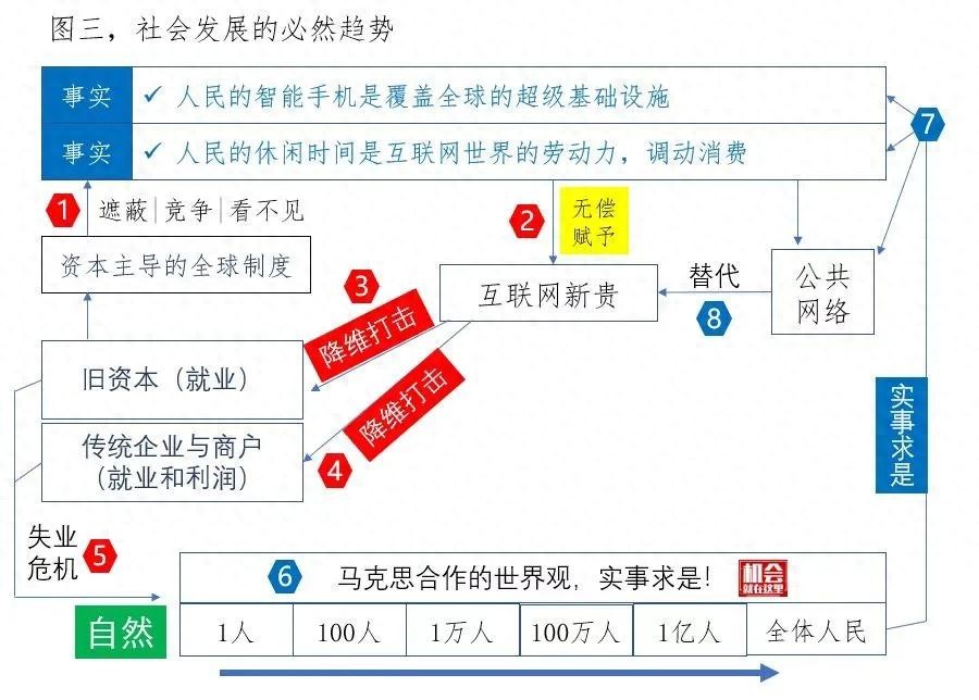 上半部分我们前面已经讲过了,看下面:我们要看到系统性危机,放下封建主义的“我不配”和资本主义的“争防抢斗”意识形态,选择马克思合作的世界观,实事求是地分析问题,找到突围方向和工具!从一到十,从十到百,从百到千,从千到万,从万到亿……直到全民,继承使用曾经“作茧自缚”的工具,也就是智能化三要素:智能手机、休闲时间和消费,建设全民所有制的公共网络,实现就业顺利迁移到智能产业(股权、知识和数据共享的自由职业),全民共同驾驭智能化生产力,开启智能社会,使国民可以永续获得经济自由和时间自由。在建设过程中,由于绝大多数人民不知道事实!这就需要先知先觉者先站起来!做人民的自媒体,摆事实讲道理,唤醒大家一起行动!人民的自媒体实际上就是互联网世界的“人民解放军”,它解放的是我们大脑中被封建主义和资本主义禁锢的思维。希望大家就都能涌跃“参军”,正义之师会把红旗插遍整个互联网,人民觉醒之日,就资本投诚之时!这是“破茧成蝶”的唯一路径!