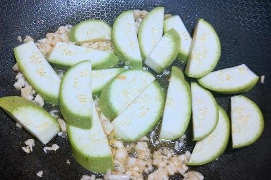 第五步:锅中加入蒜末,用稍高的油温,将蒜末中的水汽煸出,待变成金黄色后,下入西葫芦翻炒,并调入少量的米醋增加脆感。