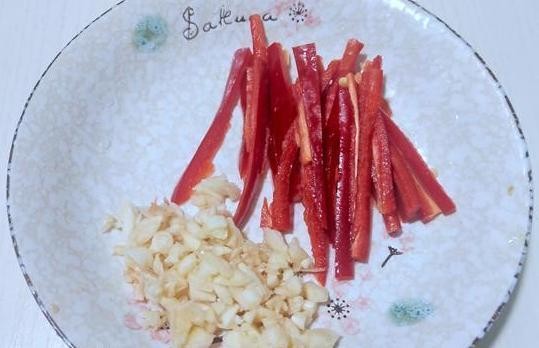 第一步:用小刀削去芥蓝的老根,如果小根直接掐断,蒜切成末,红椒切丝待用。