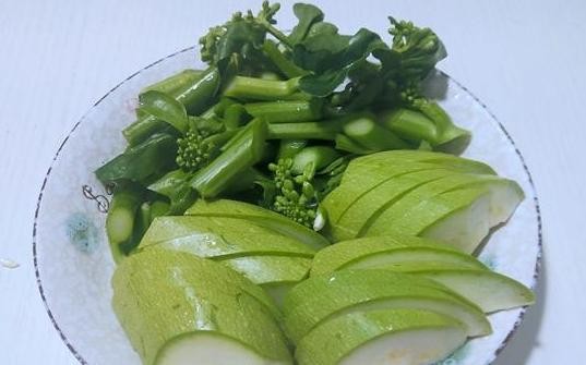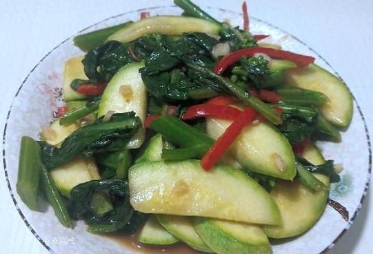 做这菜,西葫芦不能焯水,否则容易吸收多余的水分,而影响口感。芥蓝叶只需用开水烫一下即可,而芥蓝梗,较硬,不易熟,须焯水两分钟后再炒,口感会更好。