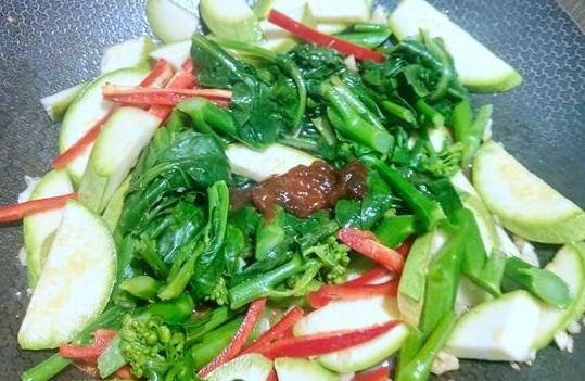 第六步:西葫芦成熟后,放入芥蓝梗,红椒丝一起炒,并调入1克盐,一勺黄豆酱,1克白糖,再加少量的水淀粉勾芡,全部拌匀即可关火出锅。