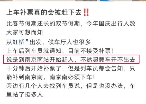 有网友在社交平台晒出,自己在好不容易抢到短程票上车补票时,却被乘务员告知,高铁抵达某一站台后,因为后续可能超载,拒绝乘客补长票,甚至不得不被“赶下车”。