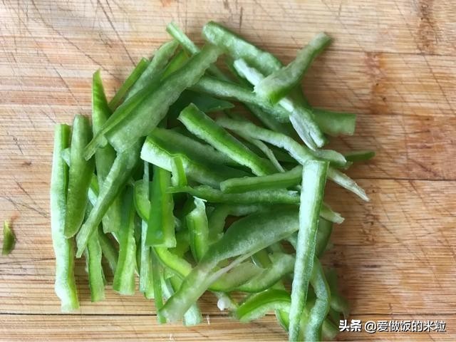 ③、把一小截尖椒洗净,切成丝。加入少许尖椒是为了增加菜肴的颜色,同时增加辣味。