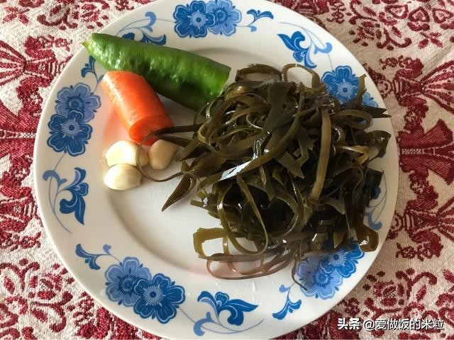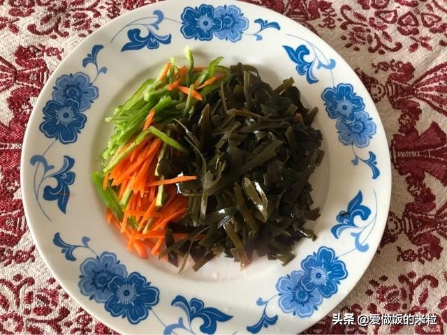 ⑤、把切好的海带,胡萝卜和尖椒放在一起备用。