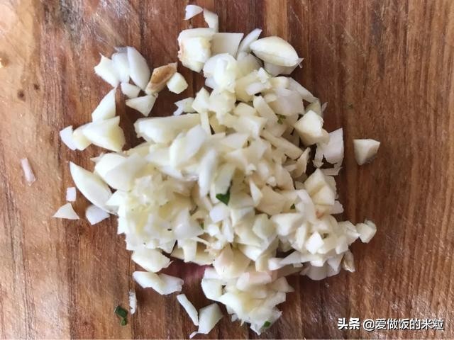 ⑦、把两瓣蒜,剥去皮,洗净,切成蒜末备用。