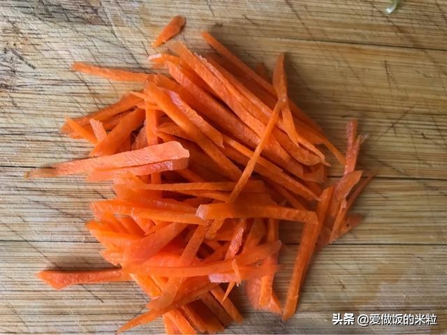④、把一小截胡萝卜洗净,先切成薄片,再切成细丝。加入点胡萝卜也是为了增加菜肴的颜色,同时多一种蔬菜,也就多一些营养成分。