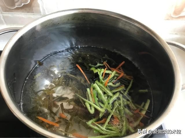 ⑨、开火,把水烧开以后,下入海带,尖椒和胡萝卜,焯水半分钟。