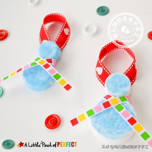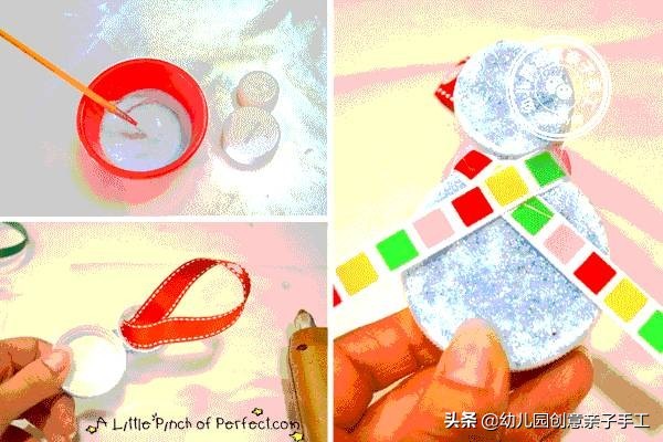 只需一个红色小彩带,粘贴在瓶盖背部。然后证明撒上蓝白色的闪粉,加点小装饰就可以囖~