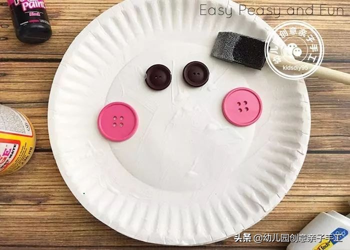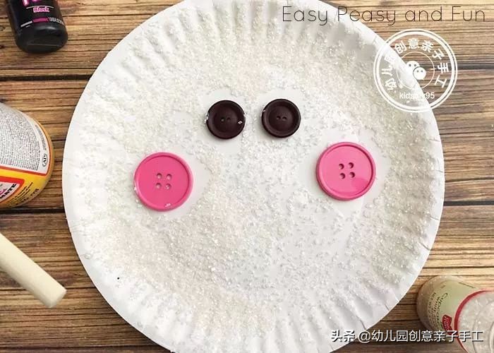 先给纸盘刷一层白乳胶,然后粘上黑色的小纽扣和粉红色的大纽扣作为雪人的眼睛和腮红,如下图。