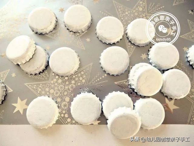 把易拉环盖全部涂成雪白色。每3个易拉环盖粘贴在一根小竹签上。如下图。