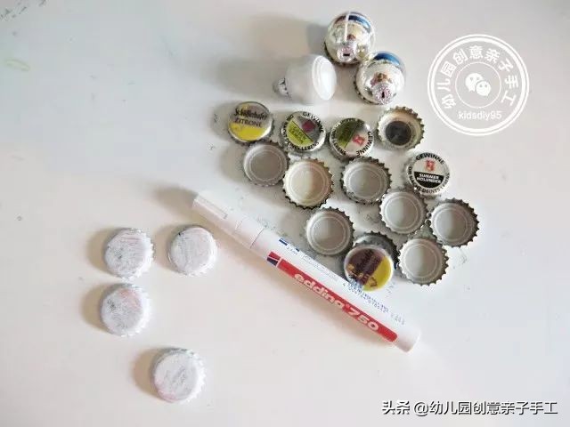【准备材料】易拉环盖,白色颜料/马克笔,黑色马克笔,小竹签,胶水,红色卡纸,适当的装饰小雪花片