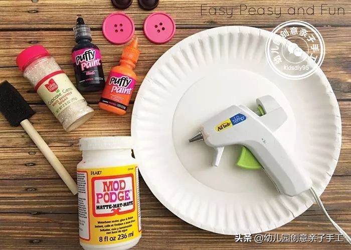 【准备材料】纸盘,纽扣,胶水,闪粉,颜料