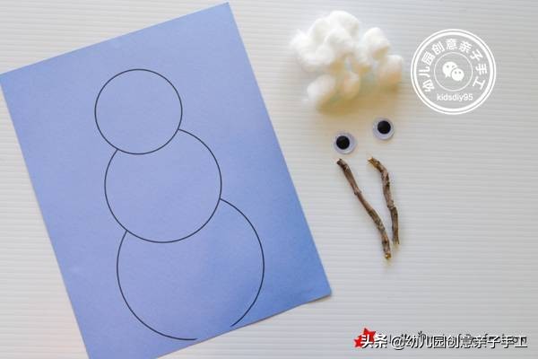 先用白色的卡纸剪出相同大小的圆形,然后粘贴在蓝色卡纸上(不需要规定孩子粘贴对齐)。然后用画笔画上眼睛和身体,再剪出一个小胡萝卜形状的橙色卡纸作为鼻子。