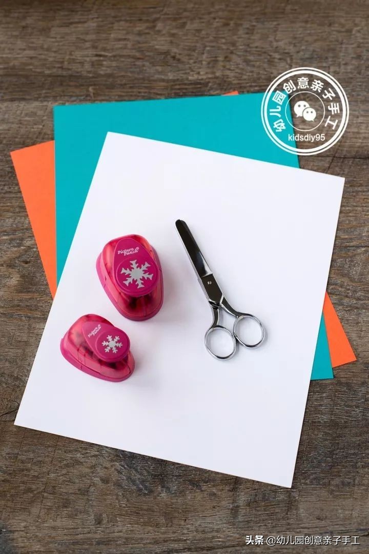 【准备材料】白色、蓝色、橙色的卡纸,雪花打孔机,黑色画笔,剪刀,胶水