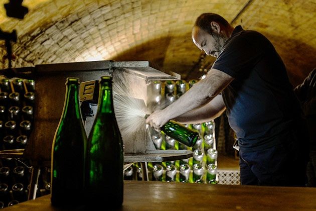 接着将瓶颈处冷冻,快速打开瓶塞,此时瓶内强大的气压将瓶口这些冷冻的酒渣团喷出,这个过程就叫作“吐泥”。