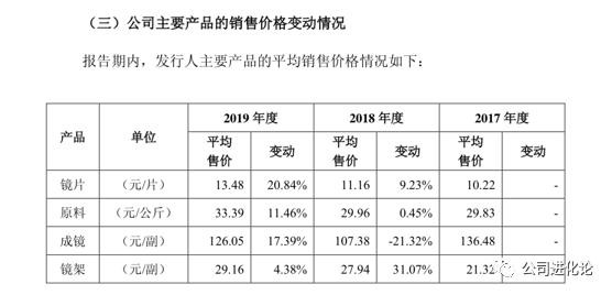 招股书则详细显示了详细价格变动情况。2017年-2019年,明月镜片平均售价为10.22元/片、11.16元/片、13.48元/片。两年间提价幅度为31.11%。其原料(明月镜片也生产一部分镜片原料)、镜架同样连续两年提价,提价幅度接近36%。