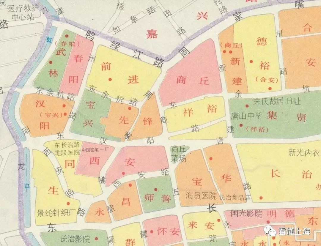 周家嘴路是一条横贯虹口、杨浦两区的主干道。它现在的西端起点处临近著名的地标“1933老场坊”(原工部局宰牲场,“看懂上海”曾经写过这里的故事,戳《1933老场坊,从宰牲场到时尚地标》一文了解详情),东端直抵杨浦区沿江干线军工路。打开一张并不算年代很久远的地图——1986年出版的《虹口区地名志》中的《东长治路街道图》,却发现当时周家嘴路自东向西过了新建路口之后不久就偏向西南方,然后变成一段近乎南北向的路,最终在东长治路长治电影院门前止步。