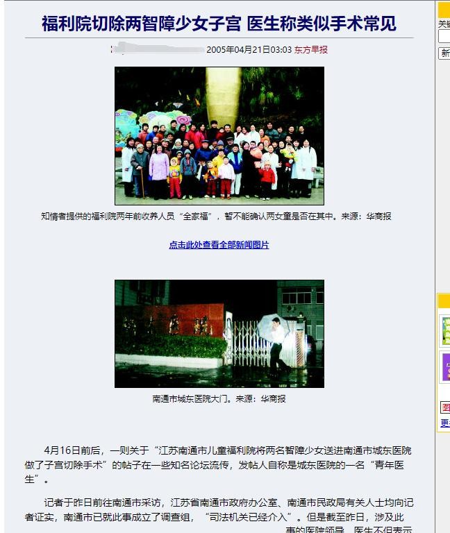 “前天,医院来了两名少女,是南通市儿童福利院送来的,两名智力有障碍的女孩子,大约十三四岁。有人告诉我,她们是来做阑尾切除手术,我当时就奇怪,好好的切什么阑尾?后来,她们看的是妇科。昨天,她们进行了手术,天啊,被切除的竟是子宫……手术是在福利院再三要求下做的,福利院的人说,两名女孩最近来了初潮,收拾起来非常麻烦,以后性成熟之后会更麻烦,反正她们也不能结婚生育,现在切了她们的子宫,省了许多麻烦。两名女孩,一个叫兰兰(为保护智障少女权益使用化名),一个叫琳琳(化名),现在还昏睡着,懵懵懂懂住在我院四楼病房里。”