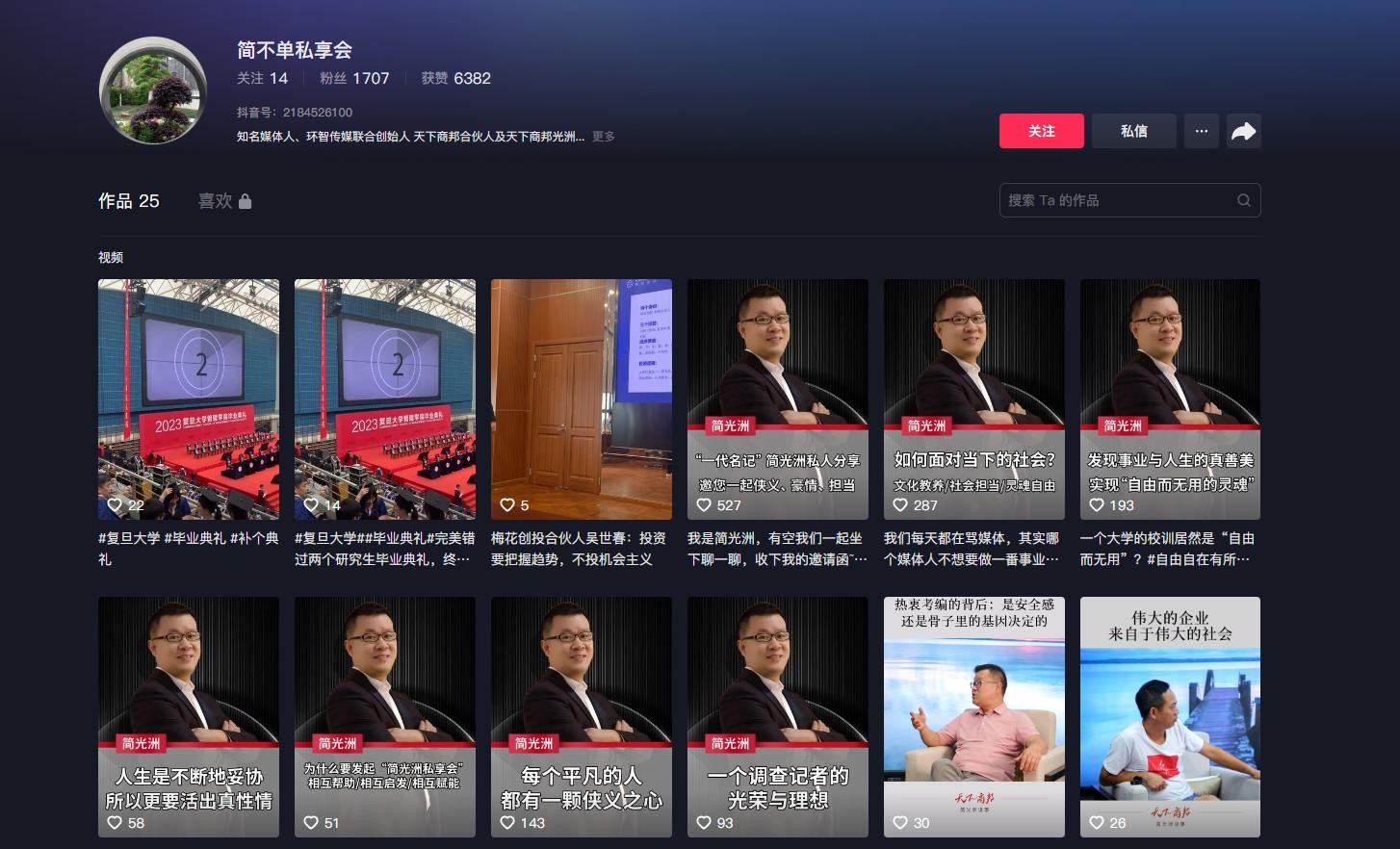 为了扩大品牌的宣传力度,在新媒体迸发的年代。简光州也在抖音上创建了自己的账号,名称为“简不单私享会”。