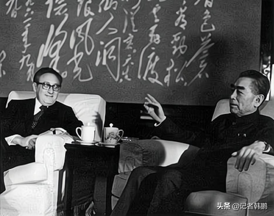 到了钓鱼台,“周总理到来之前,基辛格等4人在门厅里一字排开,站得整整齐齐,表情严肃地直瞪着那扇门,脸上写满了未知和紧张。尤其是基辛格,他的衬衫领子紧紧地卡着脖颈。”这是当时的咱英文翻译唐闻生的回忆。