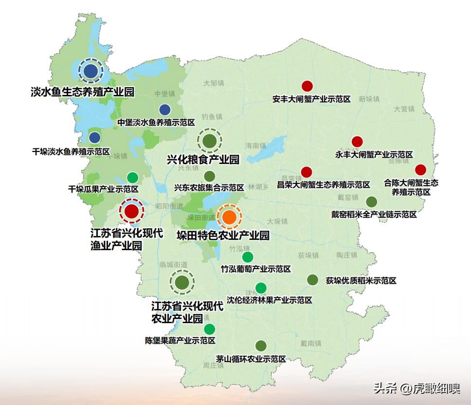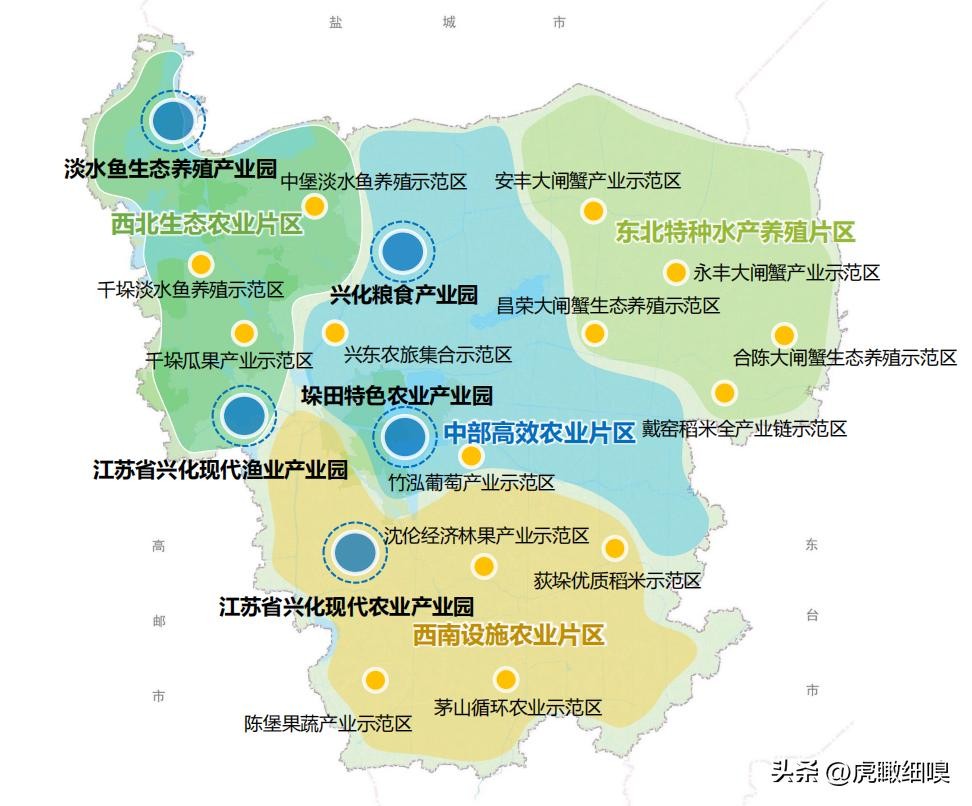 五园:江苏省兴化现代农业产业园、兴化粮食产业园、垛田特色农业产业园、江苏省兴化现代渔业产业园、淡水鱼生态养殖产业园。