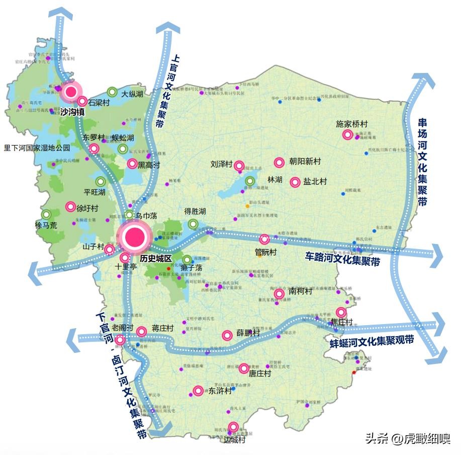 东部蟹乡水浒文旅片:注重发展高效设施农业、现代规模农业、生态农业,重点打造水浒文化园、竹泓木船文化产业园、昌荣红色旅游和安丰河蟹特色小镇、戴窑稻米科技产业园。