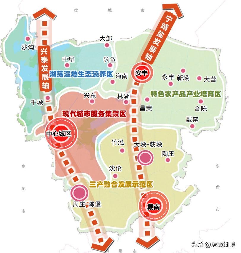 两心一极:中心城区主中心和戴南副中心,安丰增长极。